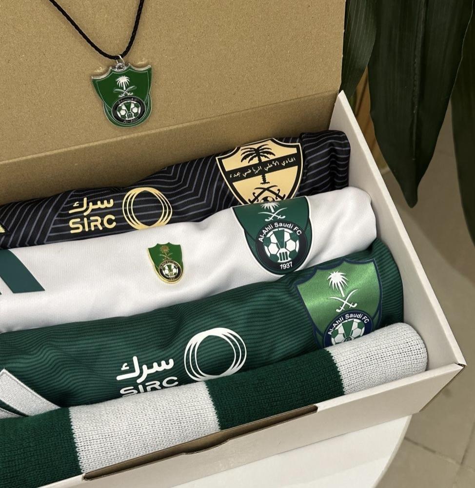 تيشيرت الأهلي الأبيض + تيشيرت الأهلي الأخضر +تيشيرت الأهلي التارثي الأسود + تعليقة الأهلي + ستكر جوال بشعار الأهلي